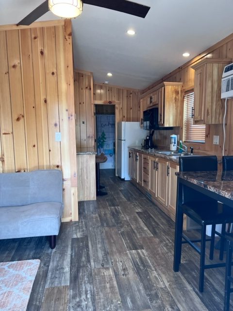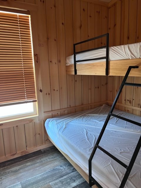 Cabins located next to the pool and beach area, sleep a total of 6 people. 1 bedroom with a queen bed and 2 lofts with 2 single beds in each. Poolside Cabins include air conditioning, refrigerator, microwave, Keurig coffee-maker, toaster, picnic table, charcoal grill, electric cooktop, and fire pit. Kitchen utensils, plates, pots & pans, and glassware are not being provided currently due to Covid-19.